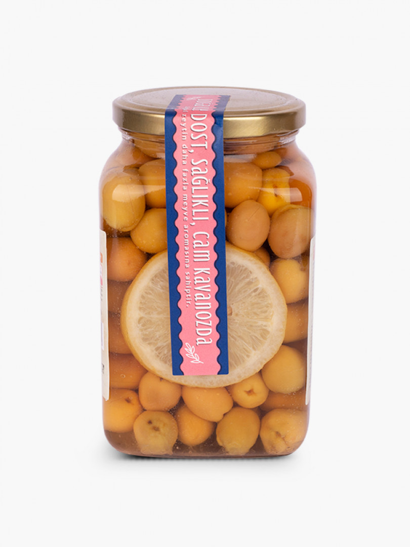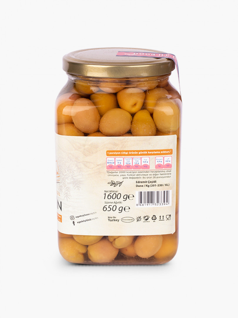 Akhisar bölgesinde ki kendi bahçelerimiz'den, Ekim ve Kasım ayında geleneksel el ile toplama yöntemi ile hasat etmiş olduğumuz, Edremit cinsi yeşil zeytinlerimizi, sadece su, kaya tuzu ve limon tuzu ilave ederek, 3 ve 6 ay arasında doğal olarak tatlandırmakta, tatlanması tamamlanmış olan zeytinleri emekçi kadınlarımız tarafından özenle seçilmekte ve zeytinleri çizdikten sonra dilim limon ve defne yaprağı ilave ederek , sağlıklı cam kavanozlarda 650g olarak ambalajlamaktayız.
