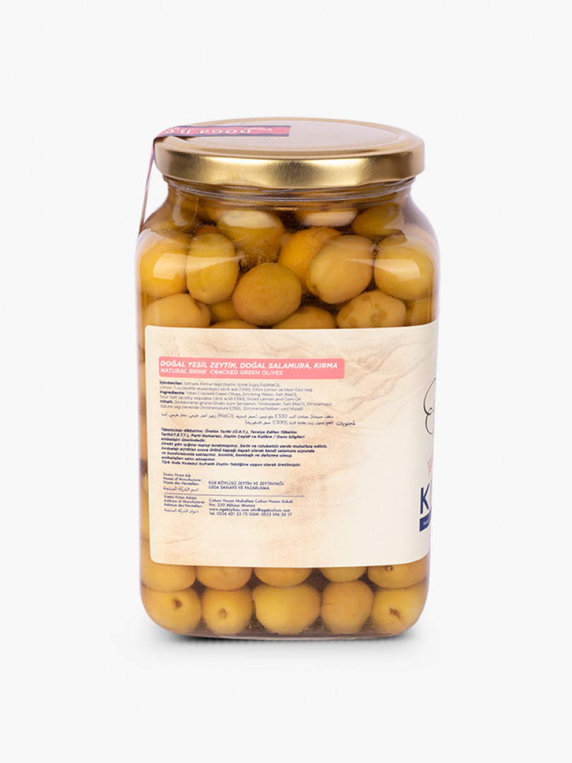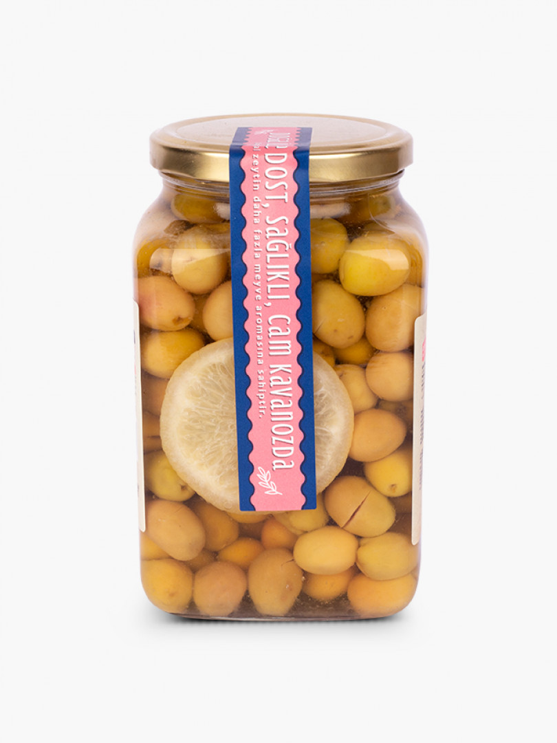 Akhisar'daki kendi bahçelerimiz'den, Ekim ve Kasım ayında geleneksel el ile toplama yöntemi ile hasat etmiş olduğumuz, Edremit cinsi yeşil zeytinlerimizi, sadece içme suyu, kaya tuzu ve limon tuzu ilave ederek, 3 ve 6 ay arasında doğal olarak olgunlaştırmakta, tatlanması gelen zeytinlerimizi emekçi kadınlarımız tarafından özenle seçilerek ve kırma işlemi sonrası dilim limon ve defne yaprağı ilave ederek , sağlıklı cam kavanozlarda 650g olarak ambalajlamaktayız.