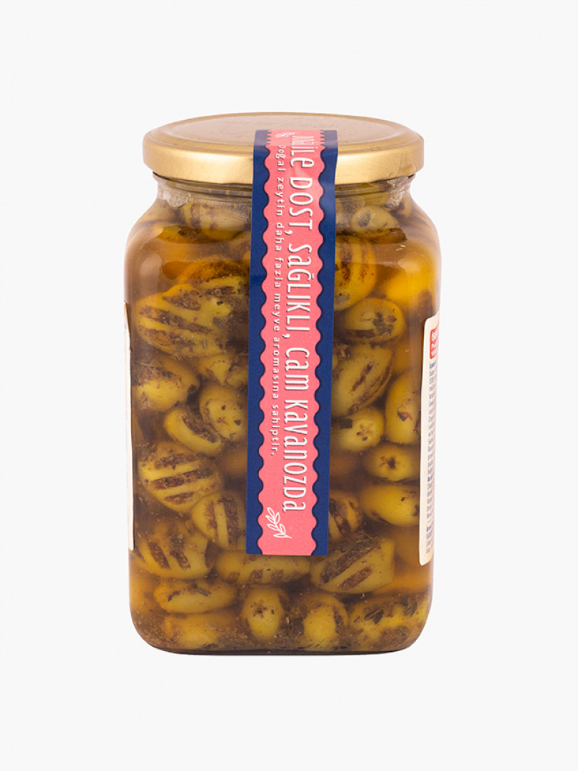 Akhisar bölgesindeki kendi bahçelerimizden zeytin hasat ayları olan Ekim ve Kasım aylarında toplamış olduğumuz, Domat cinsi yeşil zeytinlerin toplandıktan sonra içmeye suyu, kaya tuzu ve limon tuzu ilave edilerek 3 ile 6 arasında olgunlaştırılmaya bırakılır, tatlanmş olan zeytinlerin çekirdeğinin makina yardımı ile çıkarılarak ızgara makinasında zeytinler kızartıldıktan sonra sağlıklı cam kavanozlarda ambalajlanmakta ve tüketicilerimize sunmaktayız.