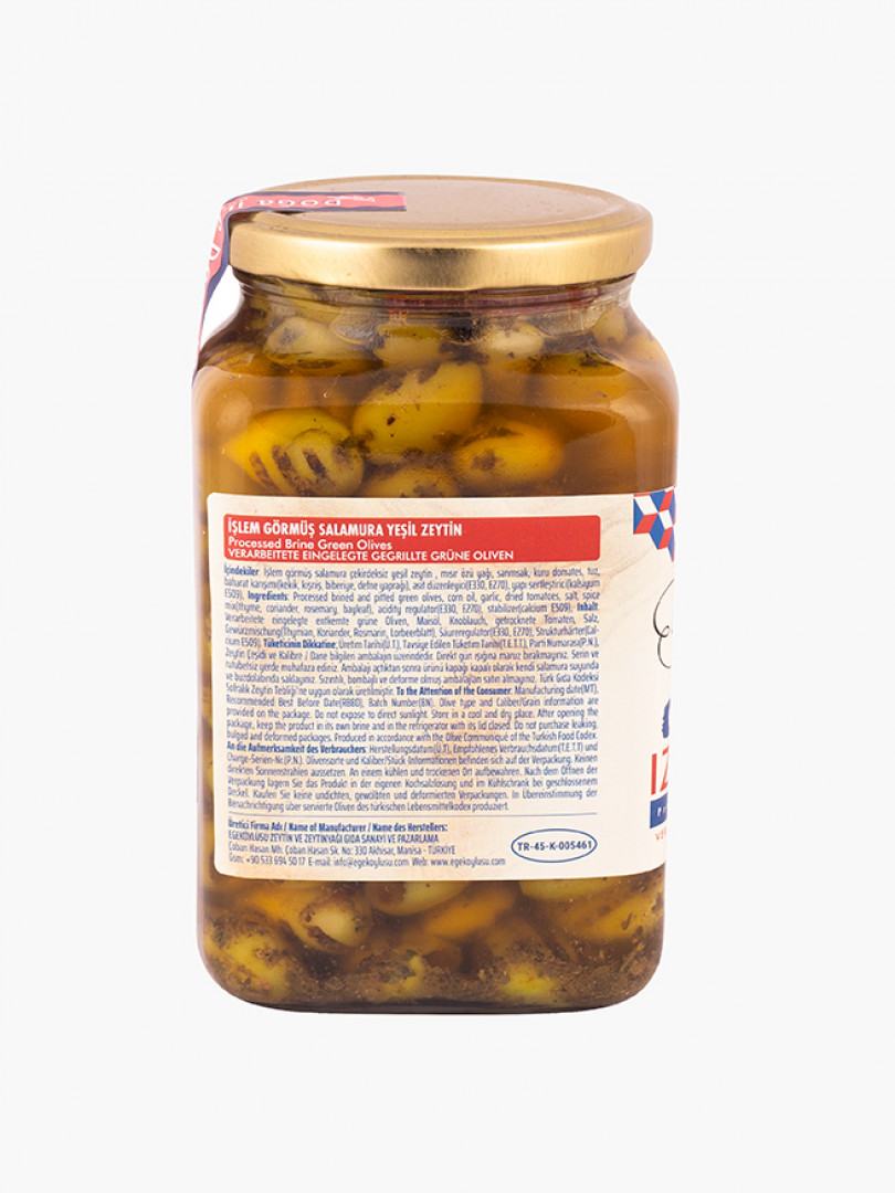 İçindekiler; İşlem görmüş salamura çekirdeksiz yeşil zeytin, mısır özü yağı, kuru domates, sarımsak, baharat karışımı (Kekik, biberiye, defne yaprağı) asitlik düzenleyici, antioksidan yapı sertleştirici.
