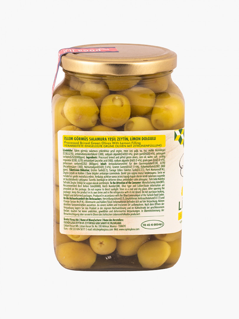 İçindekiler; İşlem görmüş limon dolgulu çekirdeksiz yeşil zeytin, salamura suyu, kaya tuzu, limon tuzu, asitlik düzenleyici , antioksidan,sodyum alganite, gram gum ve potasyum sorbate. Akhisar bölgesindeki kendi bahçelerimizden zeytin hasat ayları olan Ekim ve Kasım aylarında toplamış olduğumuz, Domat cinsi yeşil zeytinlerin toplandıktan sonra içmeye suyu, kaya tuzu ve limon tuzu ilave edilerek 3 ile 6 arasında olgunlaştırılmaya bırakılır, tatlanmş olan zeytinlerin çekirdeğinin makina yardımı ile çıkarılarak içersine hazır şerit limon dolgusu konduktan sonra cam kavanozlarda ambalajlanmakta ve tüketicilerimize sunmaktayız.